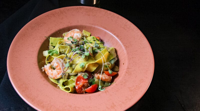 - Massa fresca com camarão, abobrinha e pesto (Nossa massa fresca, camarões grelhados, abobrinha em cubos, finalizado com molho pesto)