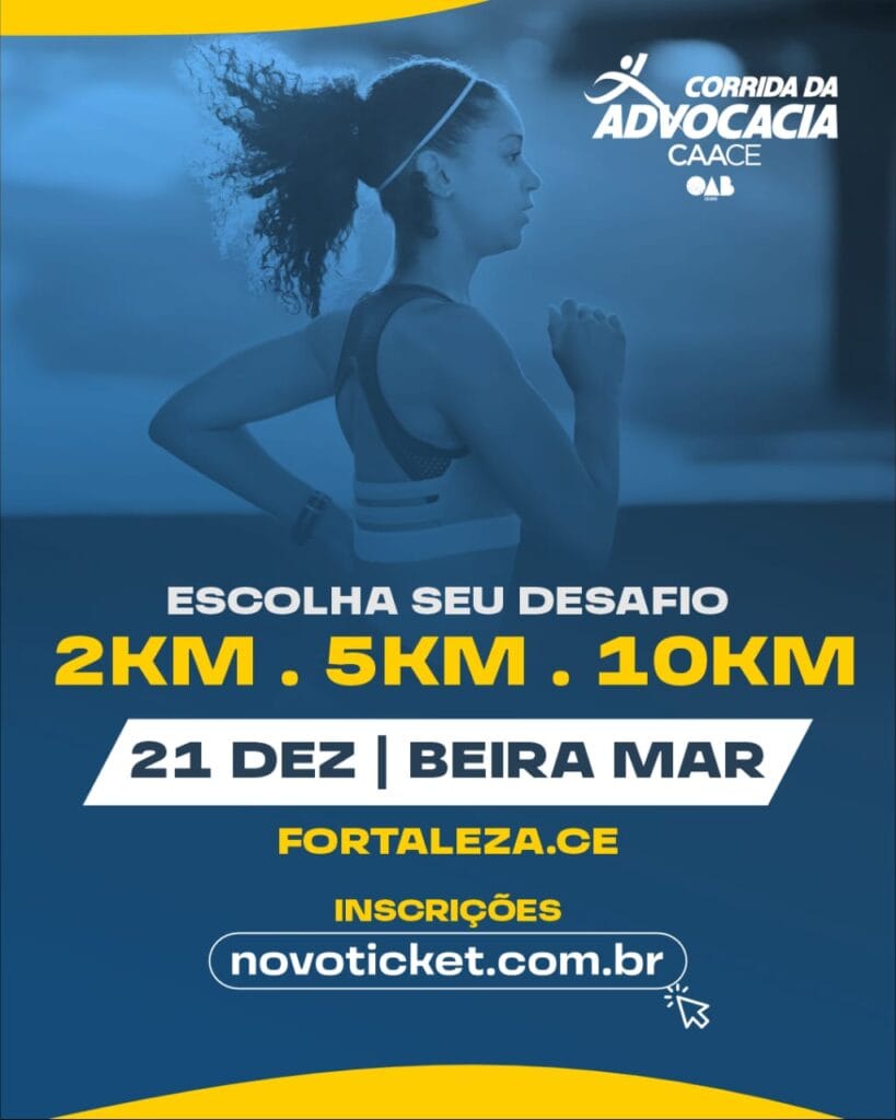 A Caixa de Assistência dos Advogados do Ceará (CAACE) realiza, no dia 21 de dezembro, a Corrida da Advocacia. O evento, que é aberto ao público, celebra o sucesso das atividades da advocacia em 2025 e terá percursos que variam de 2 km a 10 km, com largada na avenida Beira Mar. As categorias estão divididas em “Advogados”, “Cadeirantes”, “PCD”, “Idosos 60+” e “Geral”.