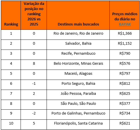 “É de conhecimento comum que muitos viajantes optam por lugares que são cartão-postal do Carnaval brasileiro, como Salvador ou Rio de Janeiro. No entanto, notamos que Belo Horizonte, por exemplo, subiu no ranking de destinos mais buscados comparado com o Carnaval de 2025 e também oferece uma extensa agenda de celebrações de rua para quem quer aproveitar o feriado na folia, mas pagando um pouco menos para isso”, comenta Gustavo Vedovato, Country Manager do KAYAK no Brasil.