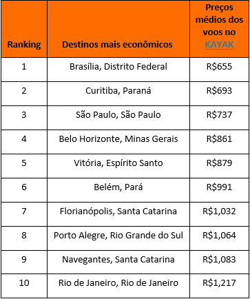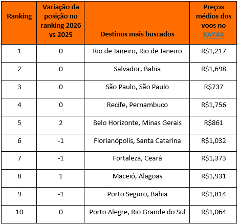 Para isso, o KAYAK, um dos principais buscadores de viagens com mais de 10 anos de atuação no Brasil, acaba de divulgar os destinos domésticos mais buscados para voos e para hospedagem entre os dias 13 e 18 de fevereiro, e opções com os menores preços médios tanto para voos, quanto para diária de hospedagem nesse período.