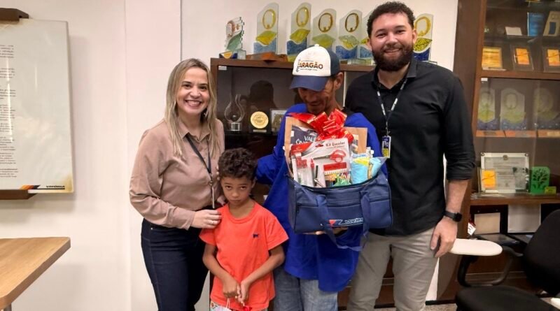 Coordenadora de RH na Empresa Vitória, Jacqueline Mendes, e Rafael Caúla (Marketing) fizeram a entrega do kit para Moisés – na foto com o avô Carlos André