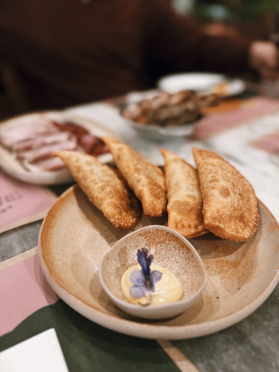 Na Cozinha Santo Antônio/ Puxadinho, a maionese segue caminho semelhante. Preparação clássica e amplamente difundida, ela ganha outro significado ao receber o pequi, fruto emblemático do Cerrado. O Pastel da Cozinha Santo Antônio leva recheio de peito de boi Curraleiro Pé Duro desfiado com requeijão moreno e é servido com a maionese de pequi, que adiciona aroma, território e memória ao prato, funcionando como extensão direta da cozinha de Ju Duarte.